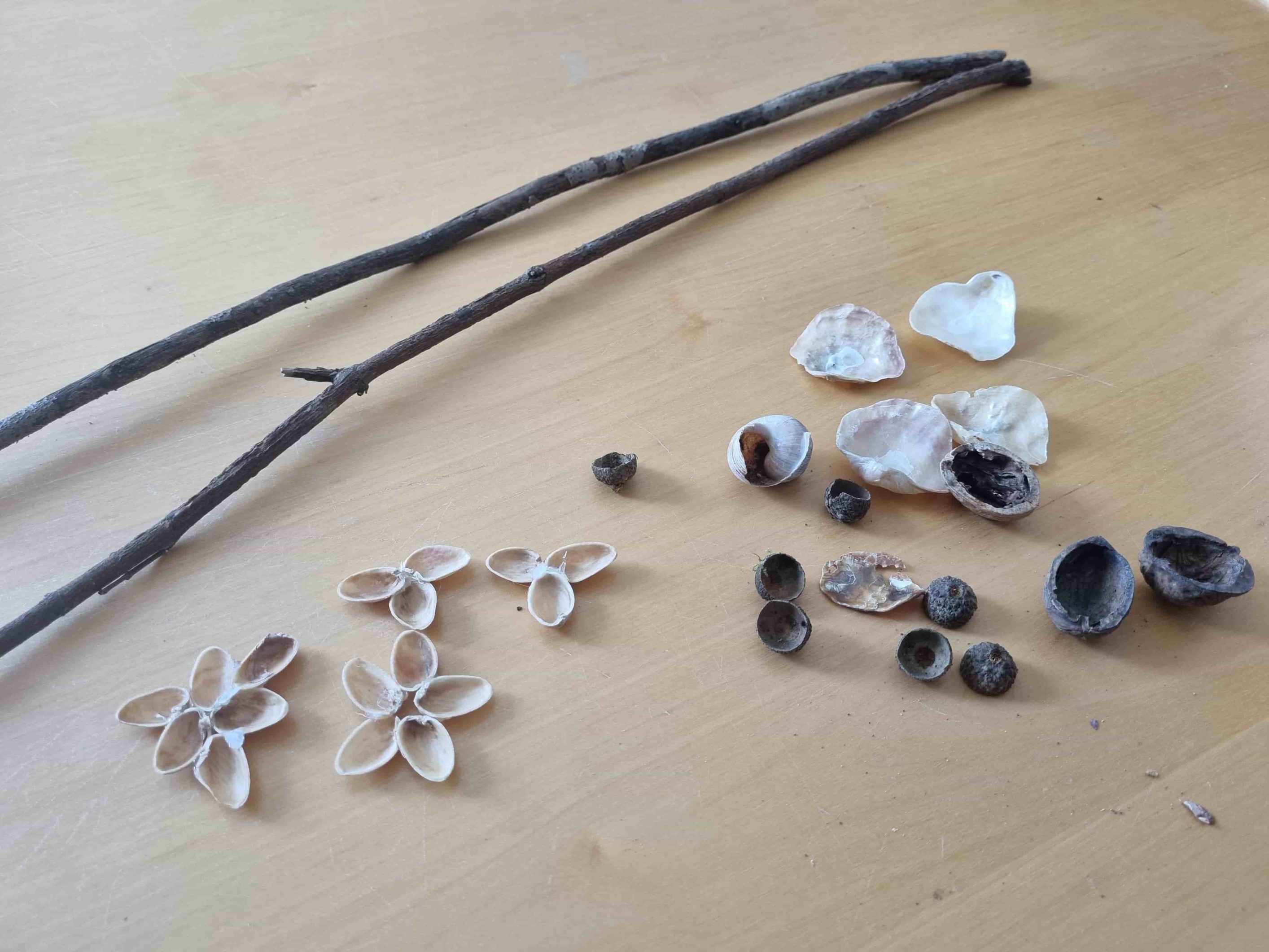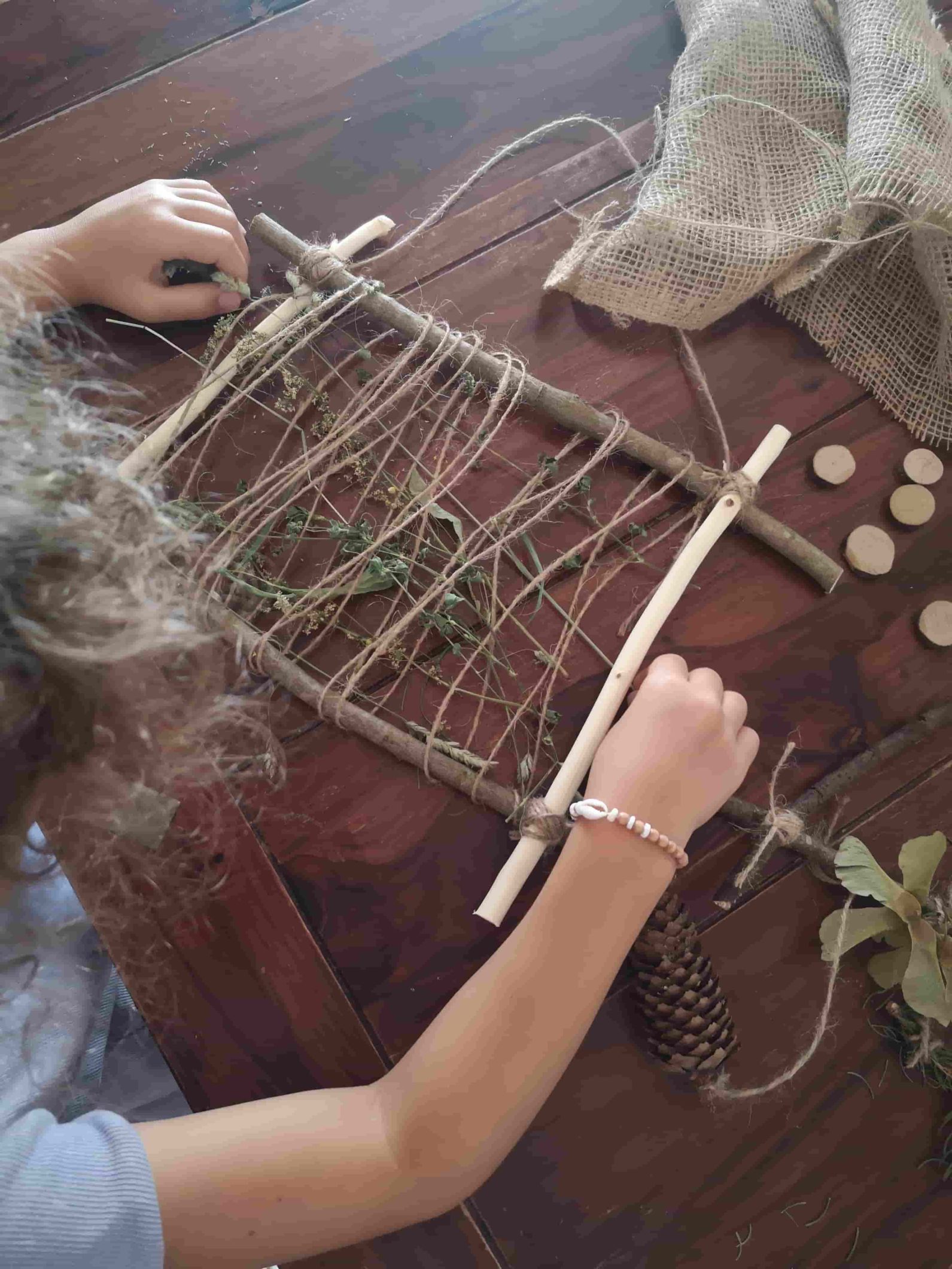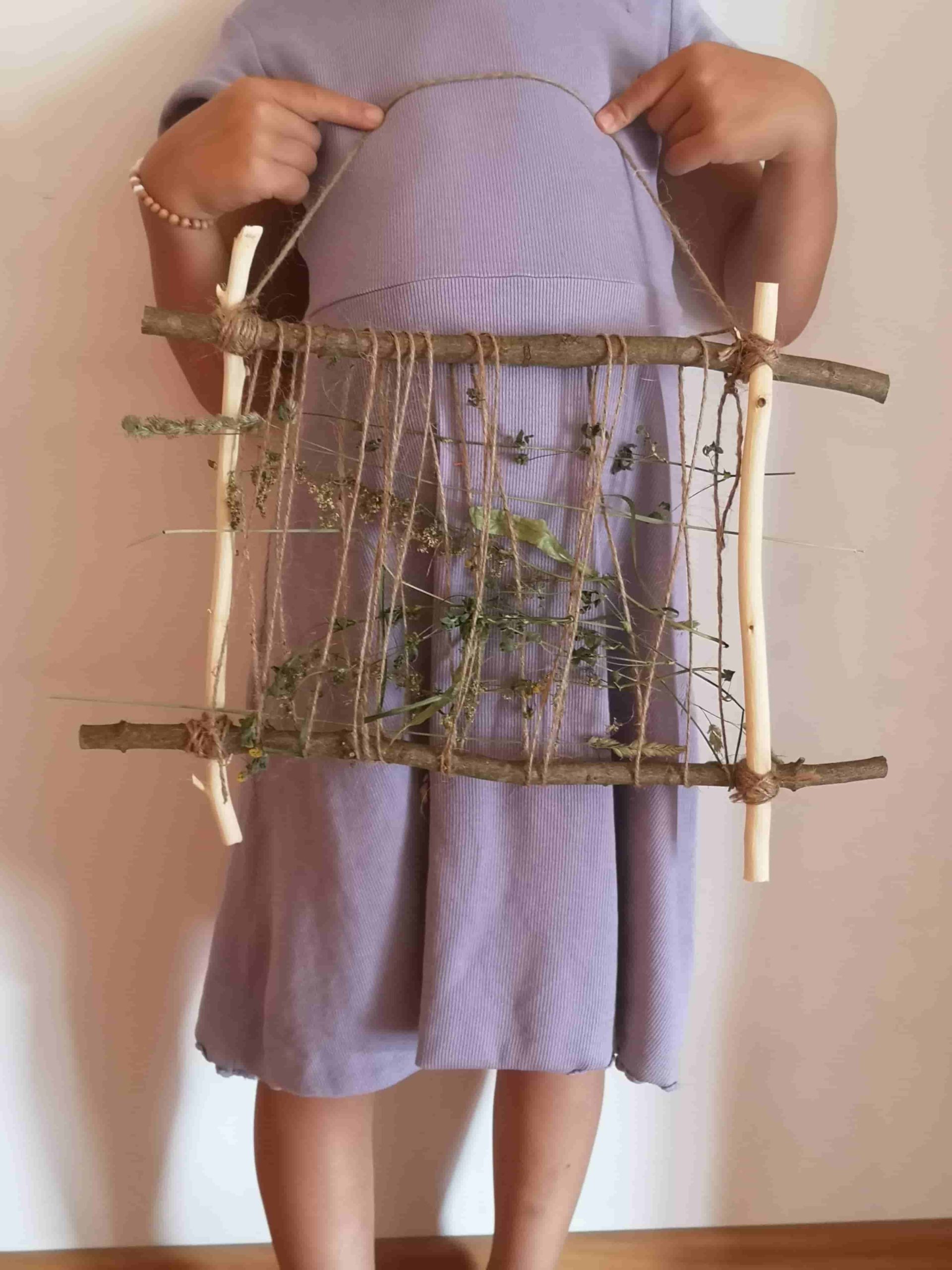 Auf einem Spaziergang durch unseren heimischen Wald haben wir kleine Stöcke, Äste, Zapfen und Gräser gesammelt. Mit einer einfachen Juteschnur haben wir aus den Stöcken einen Webrahmen gebunden und ihn mit den Gräsern und anderen Fundstücken verziert. So ist ein Stück Wald bei uns eingezogen.