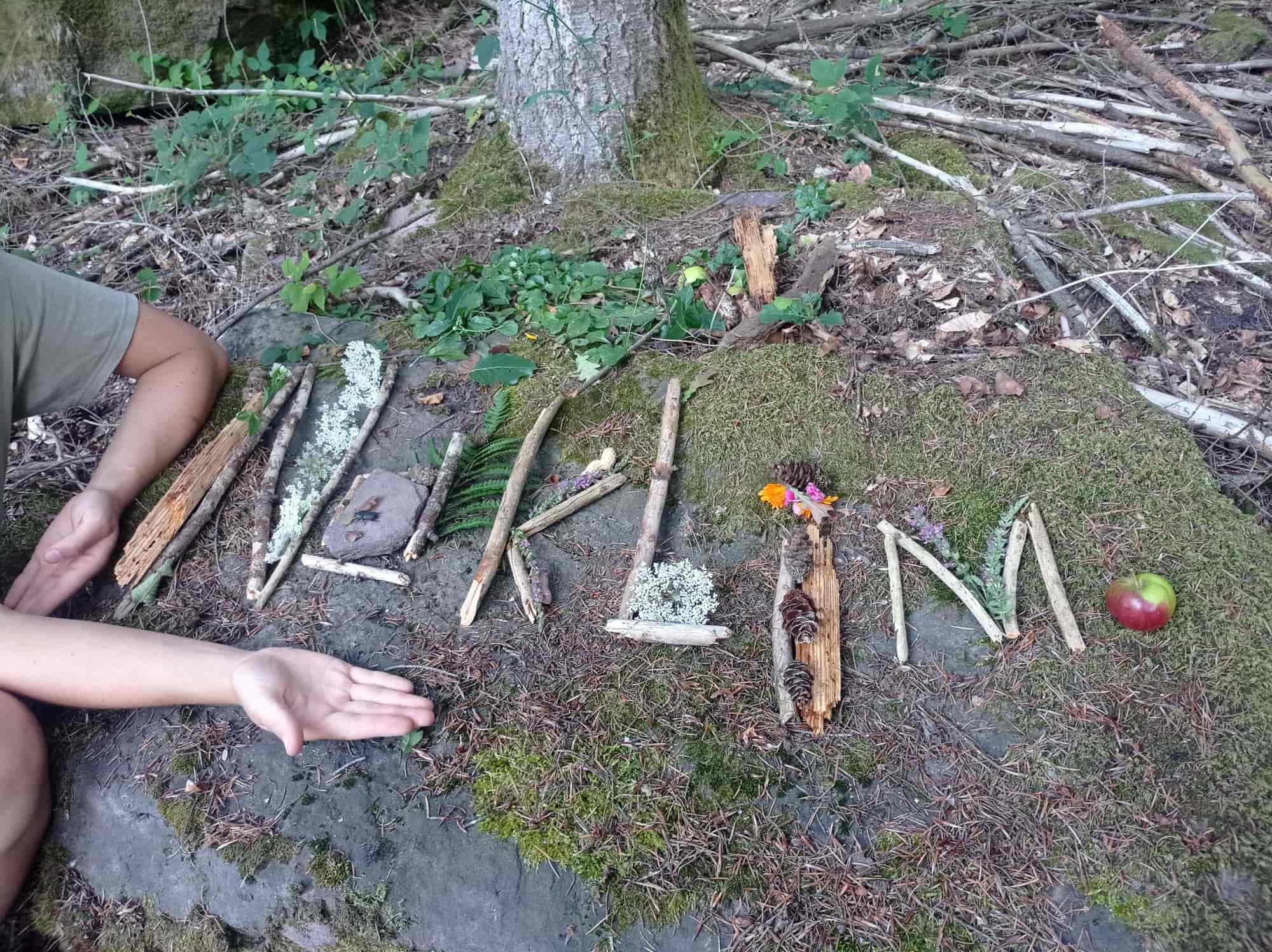 Auf einem Spaziergang durch den heimischen Wald sammelten wir, was es so zu finden gab. Bei der Suche haben wir Details des Waldes entdeckt, die wir bei normalen Spaziergängen eher übersehen. Mit Blumen und Totholz legten wir ein kleines Logo.