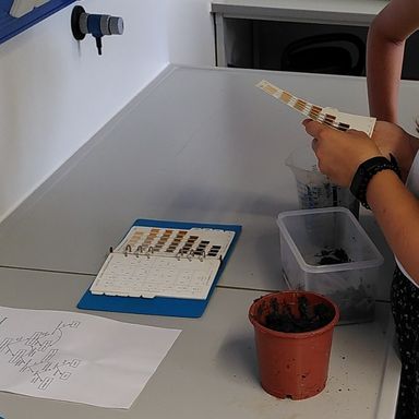 Wir haben an verschiedenen Orten unterwegs Bodenmaterial in Tüten gepackt und diese dann mit ins Labor gebracht. Wir wollten rausfinden, wie viel Humus die Proben enthalten, weil der wichtig ist für das Wachstum von Pflanzen. Weil Humus eine dunkle Farbe hat, kann man mithilfe der Farbe abschätzen, wie viel Humus der Boden enthält. Dazu gibt es spezielle Farbtafeln – ungefähr so wie die Farbtafeln im Baumarkt, mit denen man sich eine Wandfarbe aussucht. Viel genauer kann man den Humusgehalt aber herausfinden, wenn man die trockene Probe stark erhitzt und sie vorher und nachher wiegt. Dabei verbrennt nämlich der Humus und alles andere bleibt erhalten.