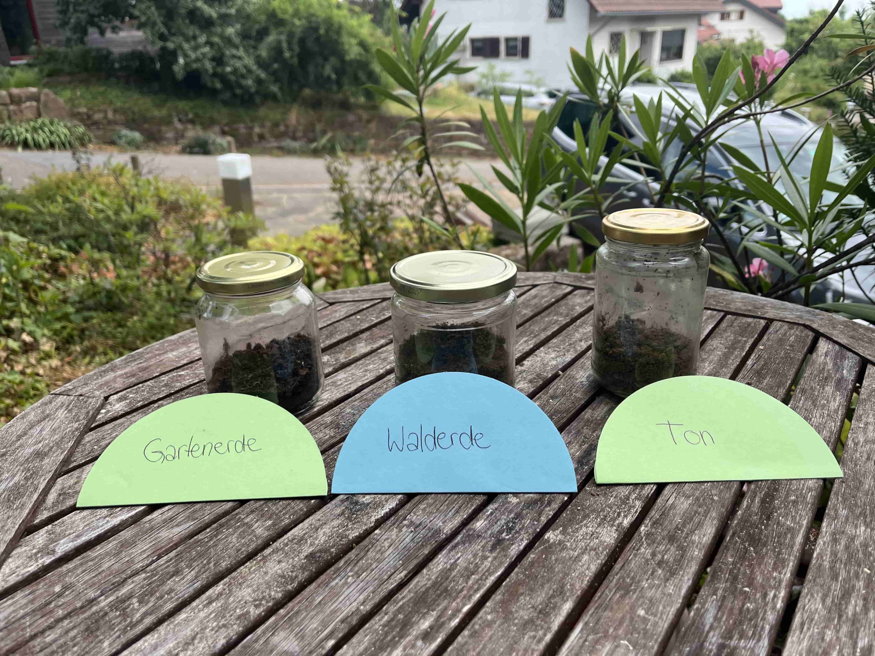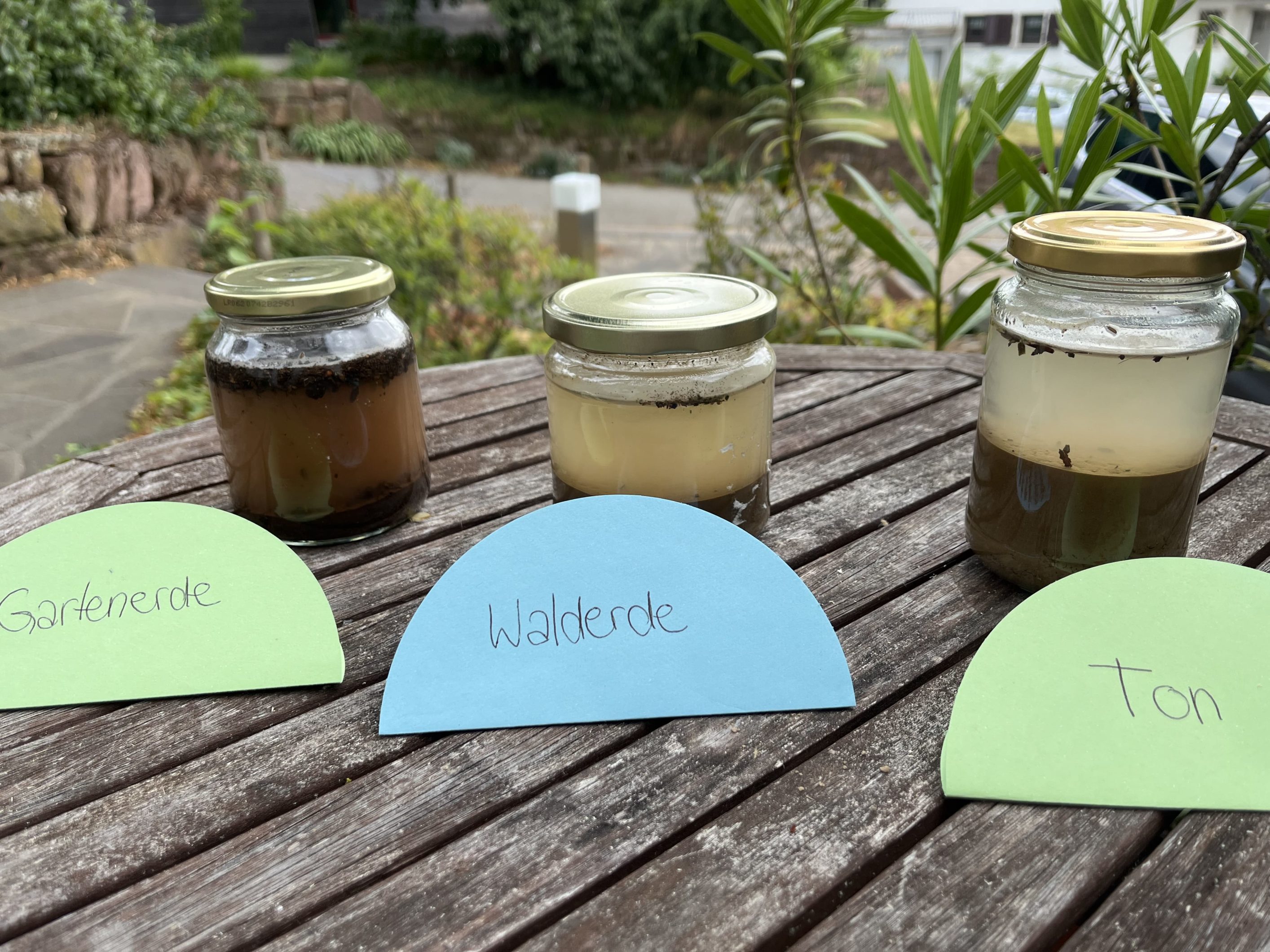 Deshalb haben wir Boden aus Garten, Wald und Ton (auch aus dem Wald) gesammelt, in Gläser mit Wasser geschüttelt und eine Weile beobachtet.