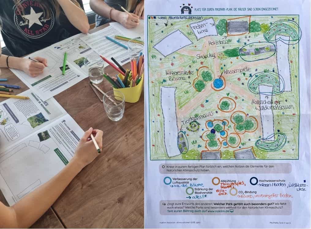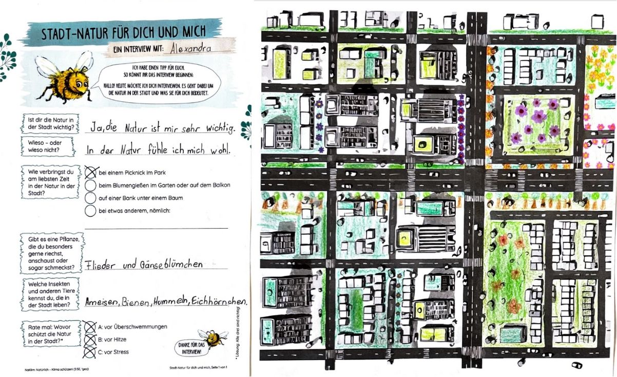 In unserem Projekt haben wir die NaKlim-Arbeitsblätter zum Thema Stadt-Grünflächen getestet. Dabei ging es um Fragen wie: Wie können wir mehr Natur in unsere dicht bebauten Städte bringen? Und wie beeinflusst Natur in der Stadt eigentlich das Klima und unsere Umgebung? Schülerinnen und Schüler haben zum Beispiel ihren eigenen PikoPark (Mini-Park im Wohngebiet) entworfen, einen Stadtplan begrünt oder jemanden zur Stadt-Natur interviewt, um herauszufinden, wie andere über Stadt-Natur denken.